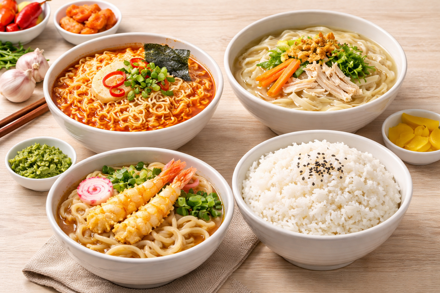 라면, 칼국수, 우동, 스파게티 같은 음식들입니다.